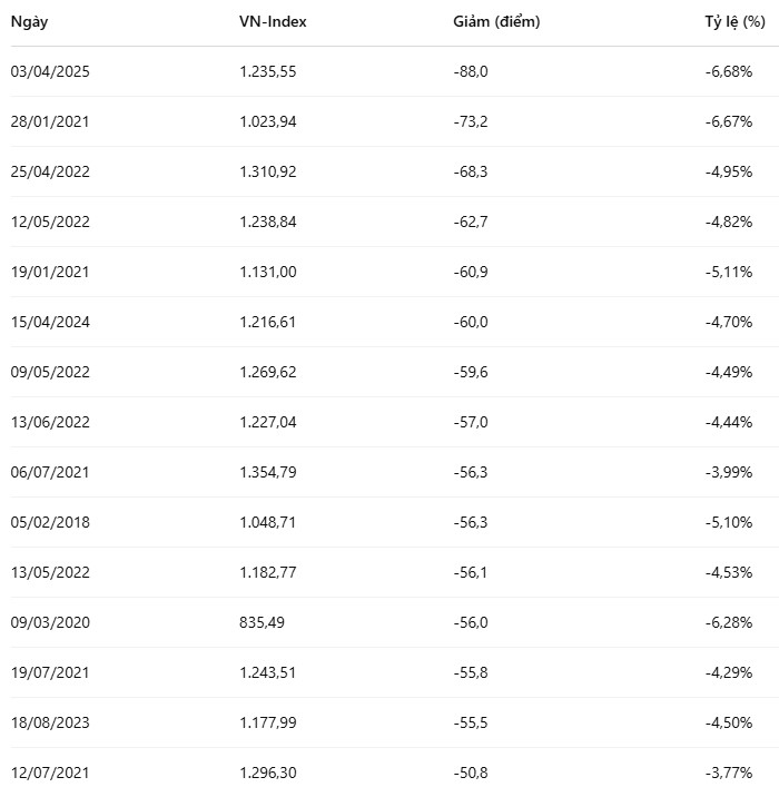 Trong quá khứ, thị trường chứng khoán Việt Nam từng ghi nhận nhiều phiên giảm sâu, nhưng chưa bao giờ khốc liệt như phiên hôm nay. Lần gần nhất VN-Index chứng kiến cú rơi tương tự là phiên 28/1/2021, giảm 73,23 điểm, tương đương 6,67%.