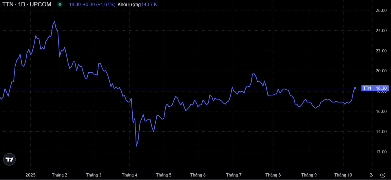 Trên sàn UPCoM, cổ phiếu TTN đã có 5 phiên tăng liên tiếp, kết phiên 9/10/2025 tại mức 18.000 đồng/cp, tăng gần 32% trong vòng một năm.