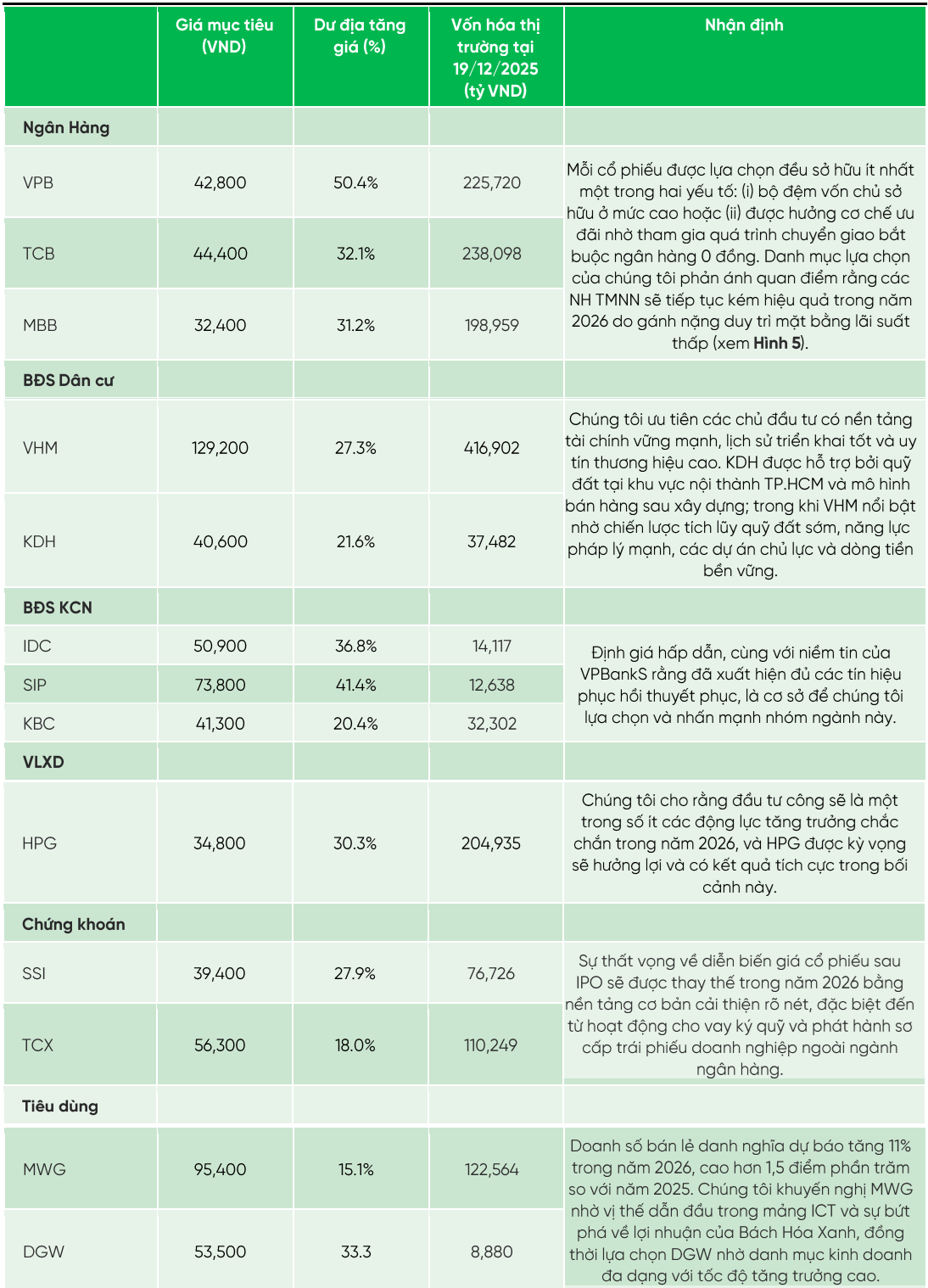 VPBankS khuyến nghị mua cổ phiếu VPB với giá mục tiêu 12 tháng đạt 42.800 đồng/cp, tương đương tiềm năng tăng giá (upside) khoảng 50% so với giá đóng cửa gần nhất là 28.700 đồng/cp (kết phiên 30/12/2025).