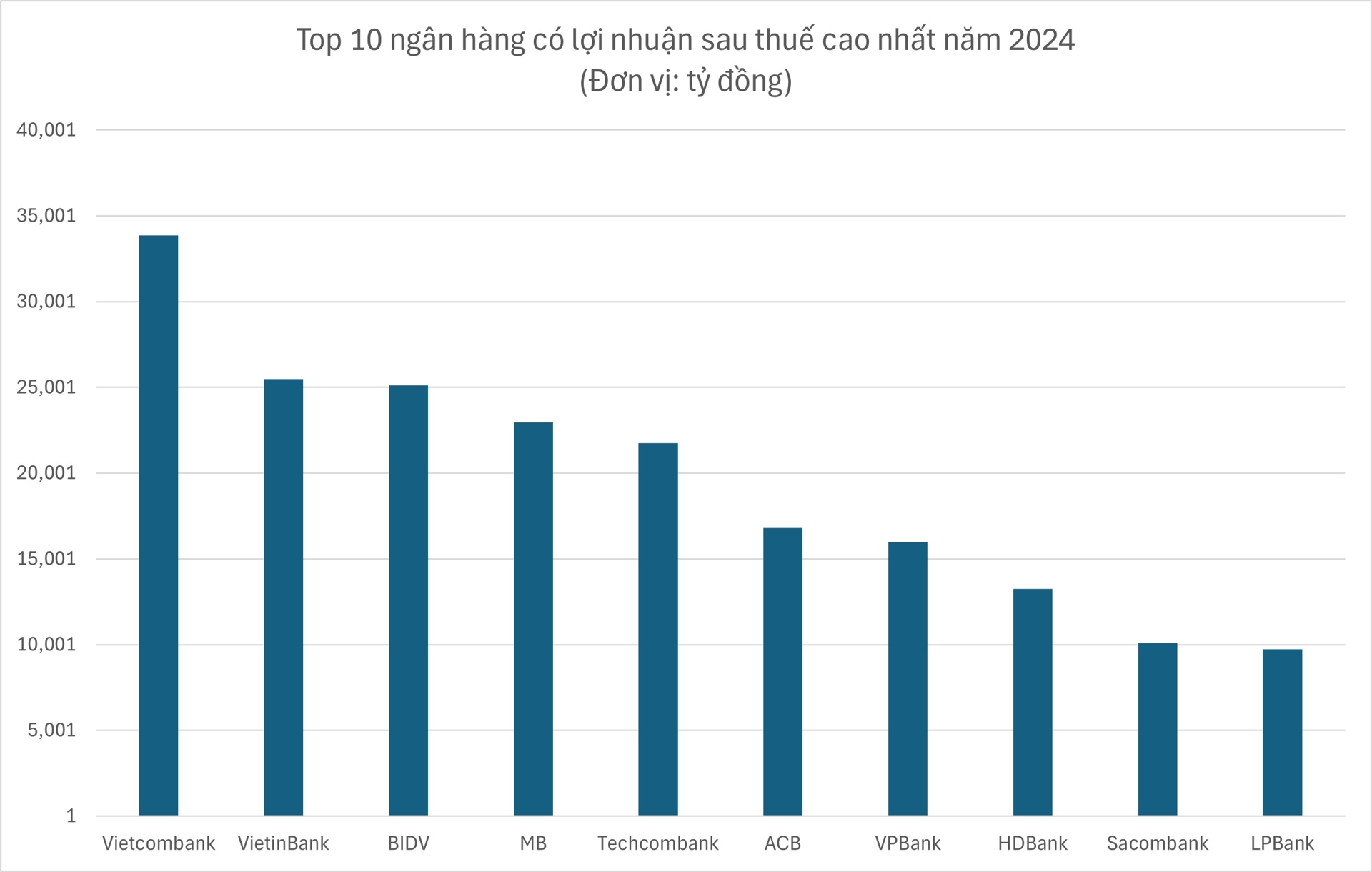 5 ngân hàng dẫn đầu ngành trong năm 2024 đều có lợi nhuận sau thuế vượt 20.000 tỷ đồng. Đứng đầu danh sách là Vietcombank với lợi nhuận sau thuế đạt 33.853,1 tỷ đồng. Mặc dù đứng đầu toàn ngành và là ngân hàng duy nhất đạt lợi nhuận trên 30.000 tỷ đồng song mức tăng trưởng của Vietcombank trong năm 2024 khá khiêm tốn, chỉ hơn 2,4%.