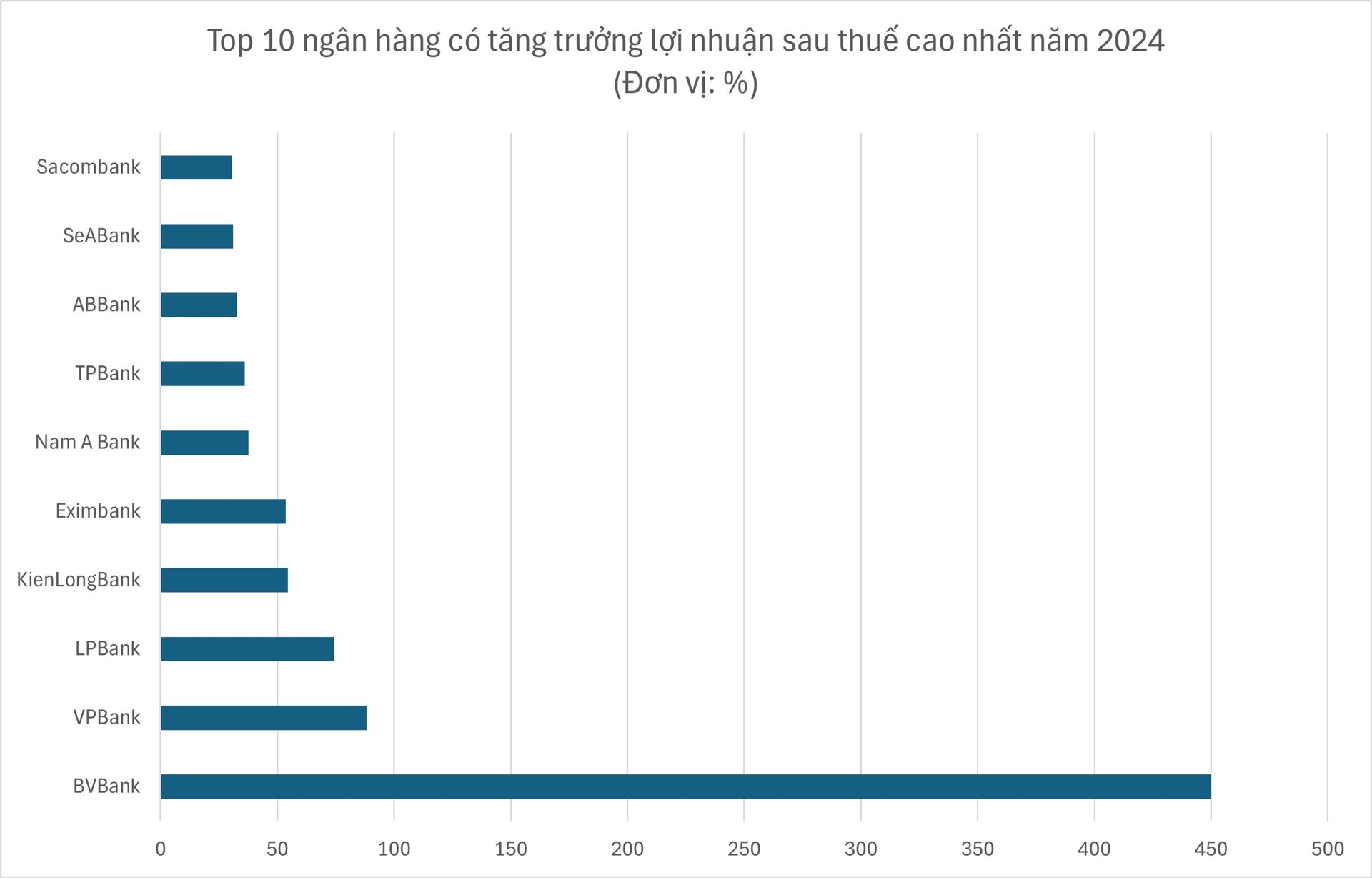 Những cái tên khác có thể kể đến như LPBank (tăng 74,4%), KienLongBank (54,6%), Eximbank (tăng 53,6%), Nam A Bank (tăng 37,6%),… Bất ngờ nhất là ngân hàng BVBank với mức tăng trưởng lên tới 449,9% trong năm 2024, đạt mức 311,2 tỷ đồng. Theo báo cáo tài chính của ngân hàng này, mức tăng trưởng lợi nhuận năm 2024 của BVBank chủ yếu đến từ hai nguồn chính là thu nhập lãi thuần tăng 56% và lãi thuần từ kinh doanh ngoại hối tăng 105,9% so với cùng kỳ năm ngoái. Tuy nhiên, dù có mức tăng trưởng ấn tượng song lợi nhuận sau thuế của BVBank vẫn nằm ở top cuối bảng.