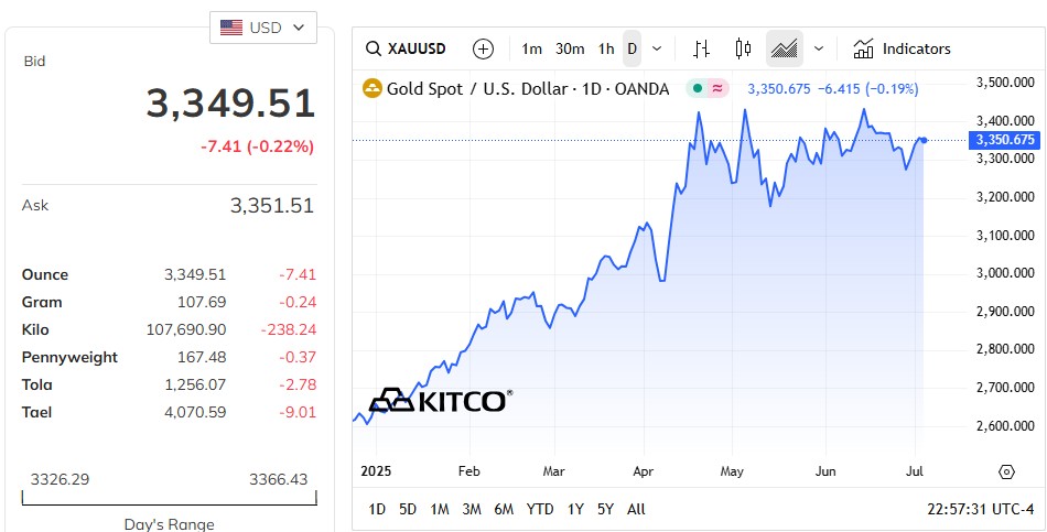 Diễn biến giá vàng thế giới từ đầu năm 2025 đến nay (Nguồn: Kitco)