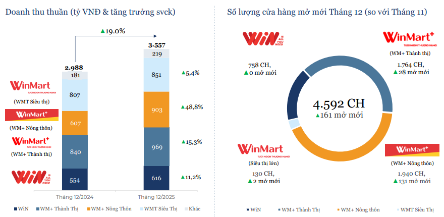 Xét theo mô hình, WinMart+ Nông thôn là mảng tăng trưởng nhanh nhất, với doanh thu đạt 903 tỷ đồng, tăng gần 49% so với cùng kỳ T12/2204. Tuy nhiên, WinMart+ Thành thị vẫn là trụ cột đóng góp lớn nhất vào tổng doanh thu của toàn hệ thống, với con số 696 tỷ đồng.