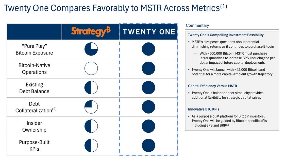 Ngược lại, Twenty One khẳng định họ là một “pure play” – tức một công ty chuyên biệt về Bitcoin, có mô hình vận hành gắn liền với Bitcoin và linh hoạt hơn trong việc gọi vốn chiến lược.