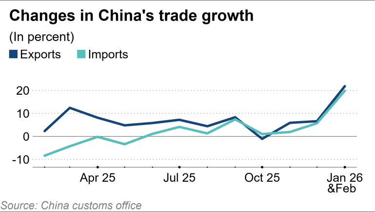 Xuất khẩu và nhập khẩu Trung Quốc tăng tốc trở lại đầu năm 2026 (Đồ họa: Nikkei Asia)