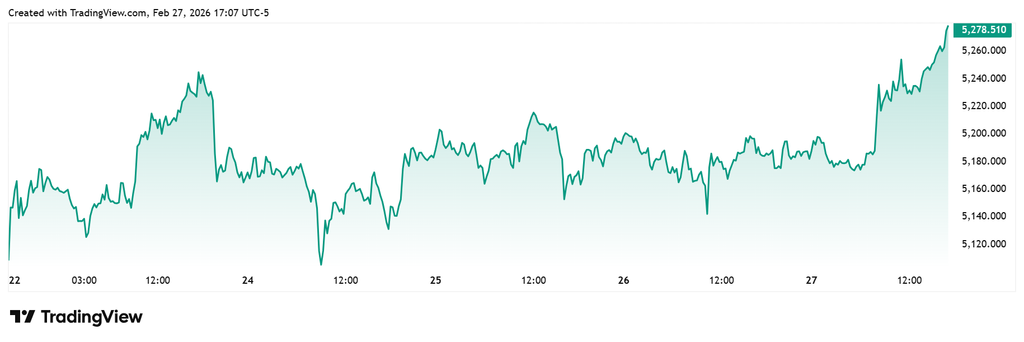 Kết phiên cuối tuần, vàng giao ngay tăng 94 USD, lên 5.278 USD/ounce – cao nhất kể từ ngày 30/1. Đây cũng là tuần tăng thứ ba liên tiếp của kim loại quý.