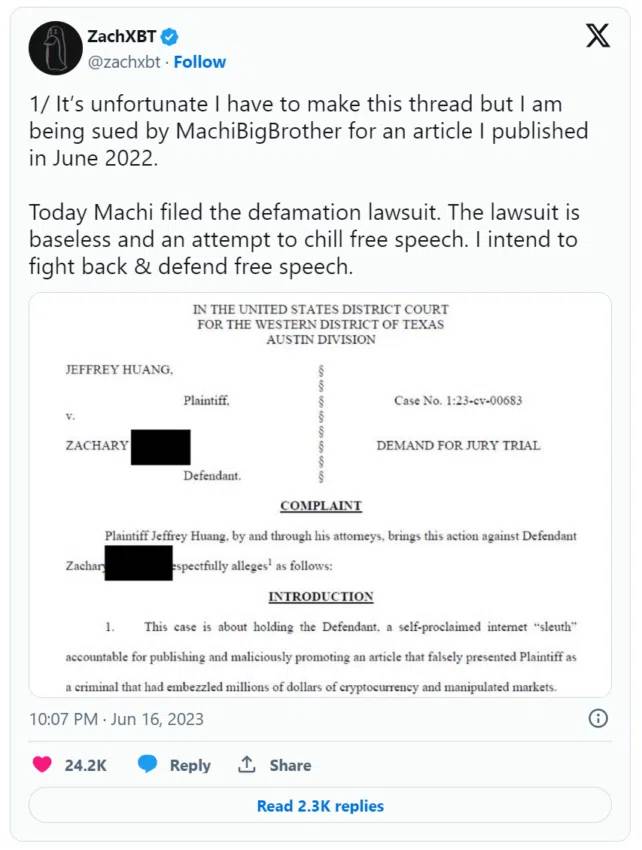 Vụ kiện tụng giữa ZachXBT và Jeffrey Huang - một doanh nhân tiền điện tử gốc Đài Loan.